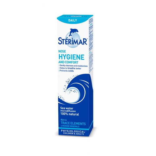 Sterimar Daily sprej za nos je odličan proizvod za svakodnevnu nosnu higijenu odraslih. Sadrži otopinu morske vode koja vlaži nosnu sluznicu, nježno čisti nos, olakšava disanje i odčepljuje nos. Otopina je bogata elementima u tragovima i mineralima iz prirodnih izvora. Mogu je koristiti djeca i odrasli.